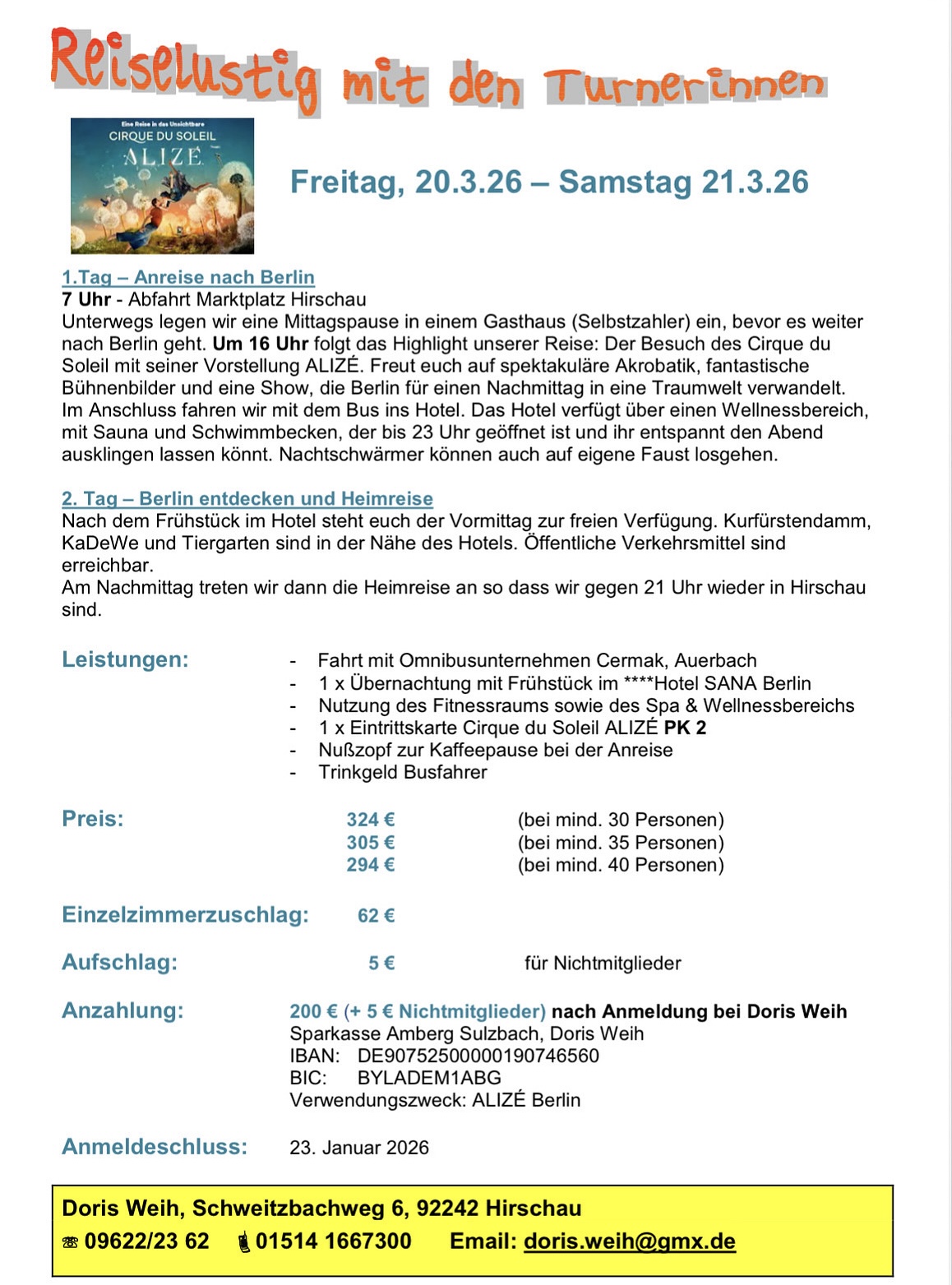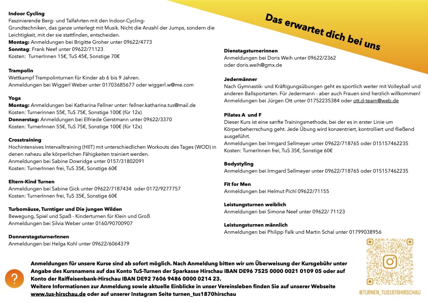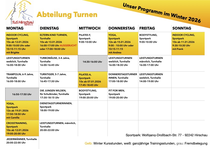 Wir bitten auch die Mitglieder der Abteilung Turnen, sich für die Kurse beim Übungsleiter anzumelden, um einen besseren Überblick über die Teilnehmerzahlen behalten zu können.